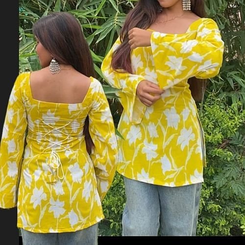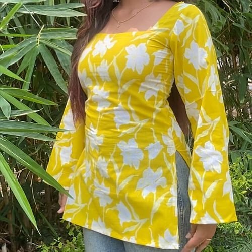 Home › Products › Ladies Short Kurti › Ladies Yellow Cotton Floral Printed Kurti